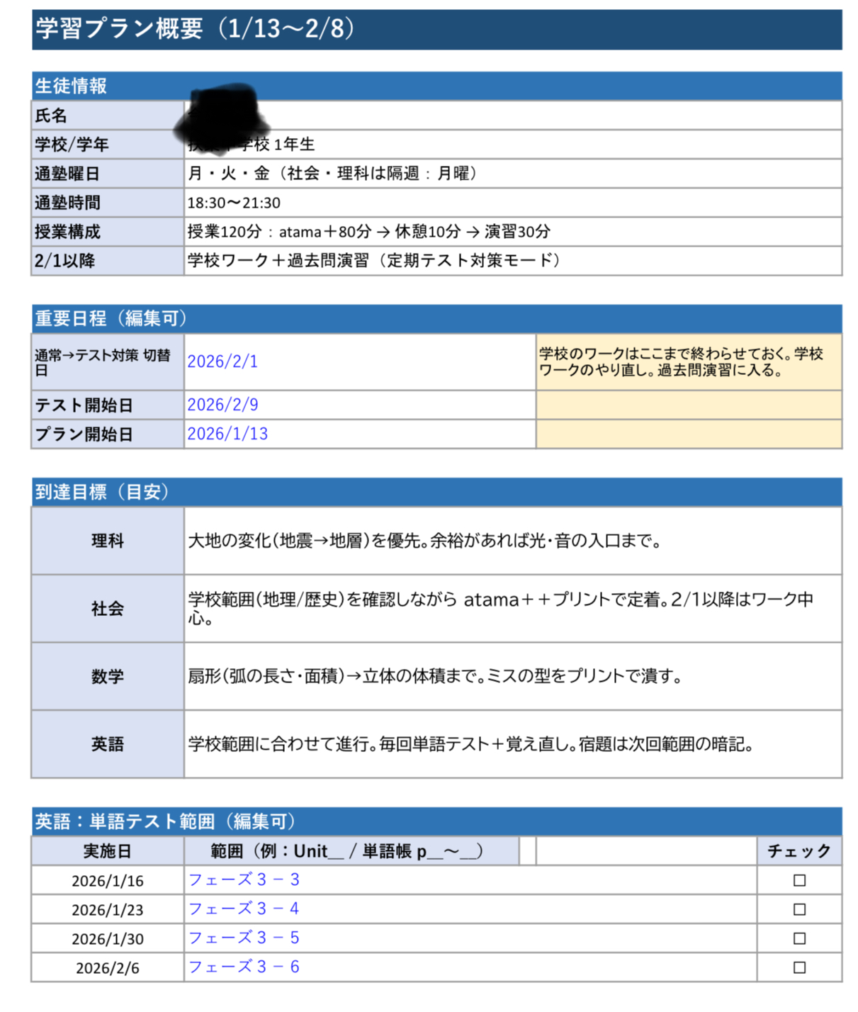 下記は、(ある中学1年生の)1月~定期テストまでの授業プランと(ある中学3年生の年末年始)の学習プランです。こうしたものを一人ひとり作成していくことになります。↓↓↓